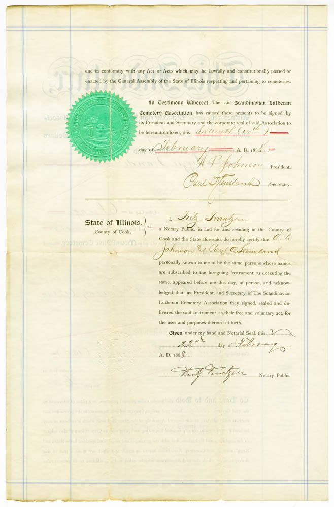 Lizzie Hande Mount Olive Cemetery, Chicago. Burial plot payment receipt. February 16, 1888