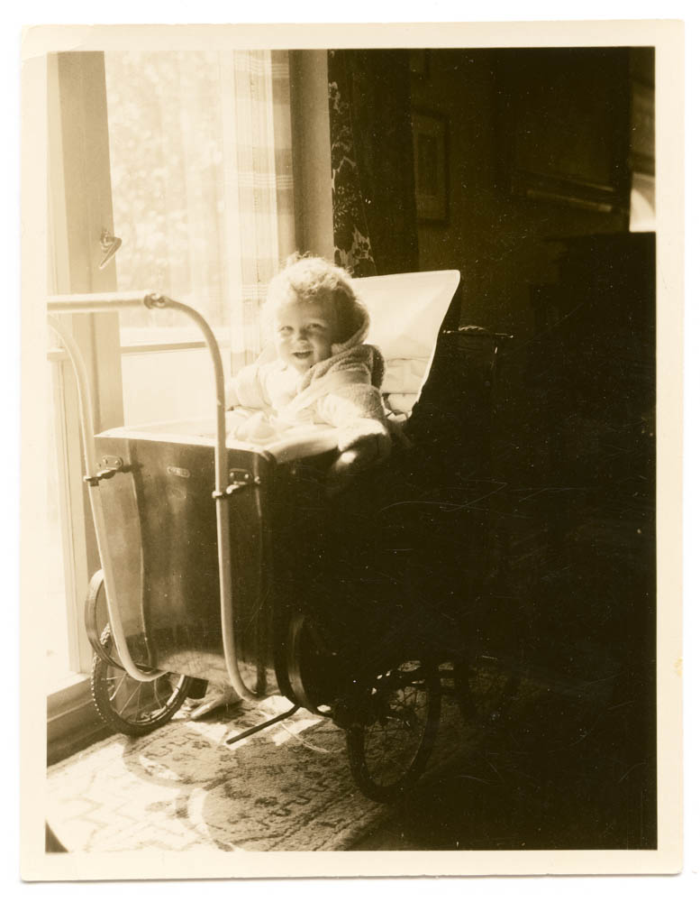 A. Kåre Hellum in child buggy.