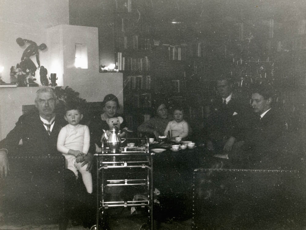 L-R: Unknown woman, Fredrik (Fritz) Midelfort, Margarita Midelfort (née Hande), Hans Christian Ulrik Midelfort, Esval, unknown woman. – ca 1935
