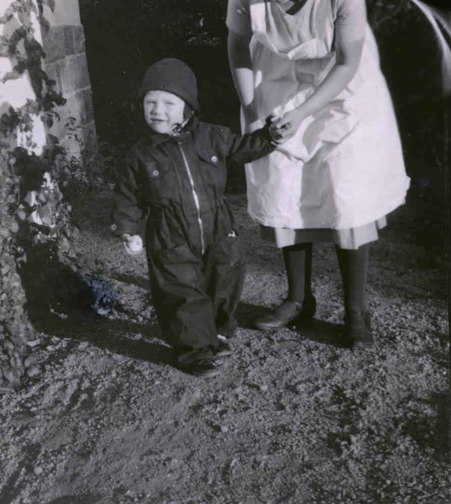 “This is awfully good of Paasan’s face now but Kåre wouldn’t stand still.” A. Kåre and Ulrik Hellum with nurse at Karlsrostredet 8 Larvik, Norway Summer 1935
