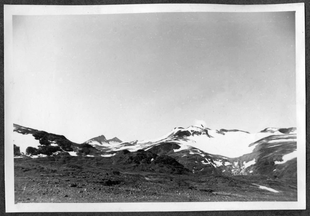 Scanned from original neg. Photo by A. Kåre Hellum Halvard Hellum in foreground? Ulrik Hellum with hat? Unknown person in middle. Gunn, the dog. circa 1949