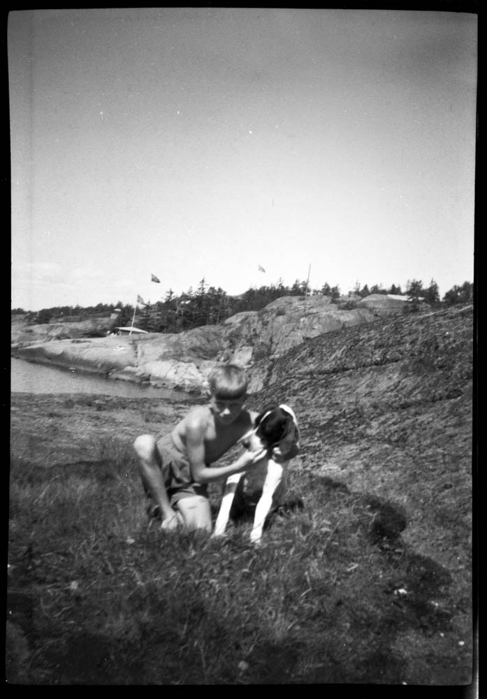 Scanned from original neg. Photo by A. Kåre Hellum Halvard Hellum with dog (Gunn?) at Repshagen. circa 1949