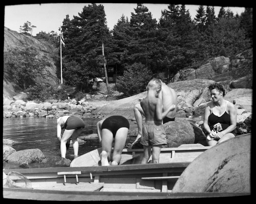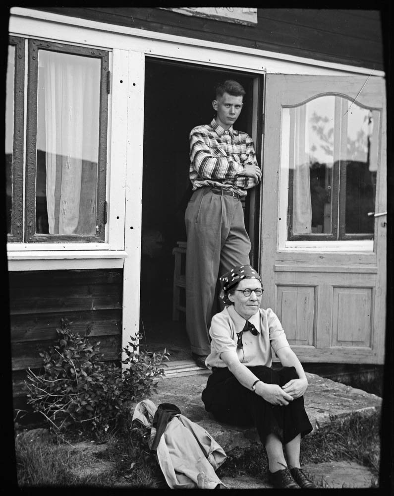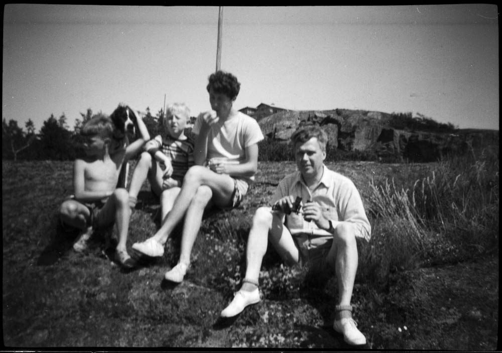 Scanned from original neg. Photo by A. Kåre At Repshagen cottage. Louise Hellum at left, Halvard Hellum at centre, Ulrik at rear. Unknown woman at right. Kåre at centre left? circa 1949