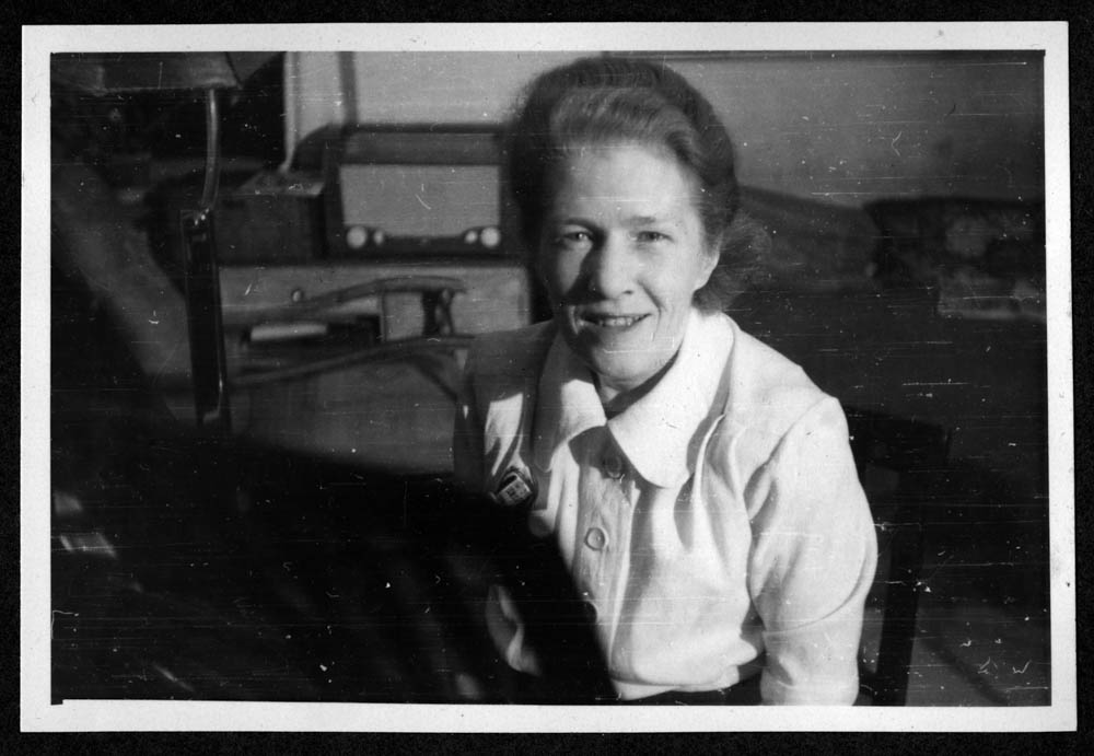 Anna Louise Hellum (née Midelfort) playing piano at Karlsrostredet 8.