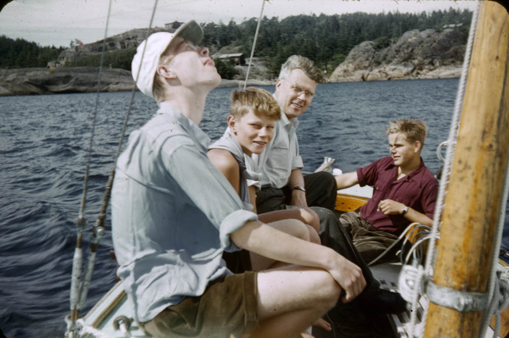 August Hellum in boat with Halvard (right), Jörgen Flood at the sail and Koas (?) at centre.