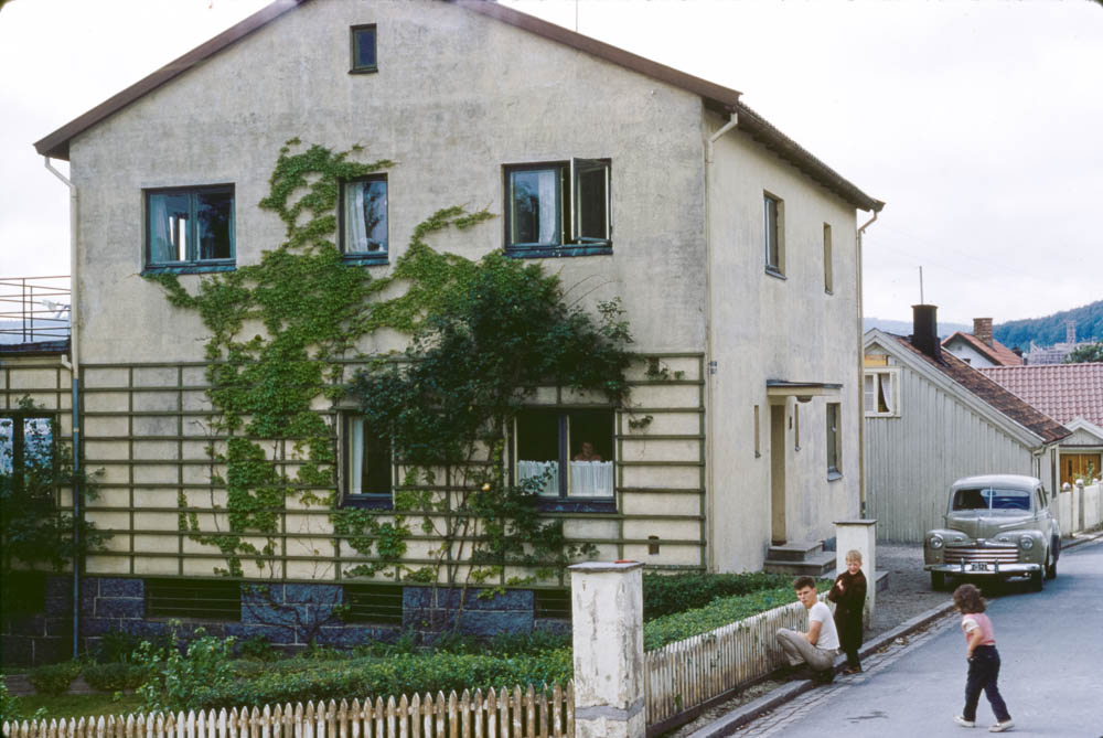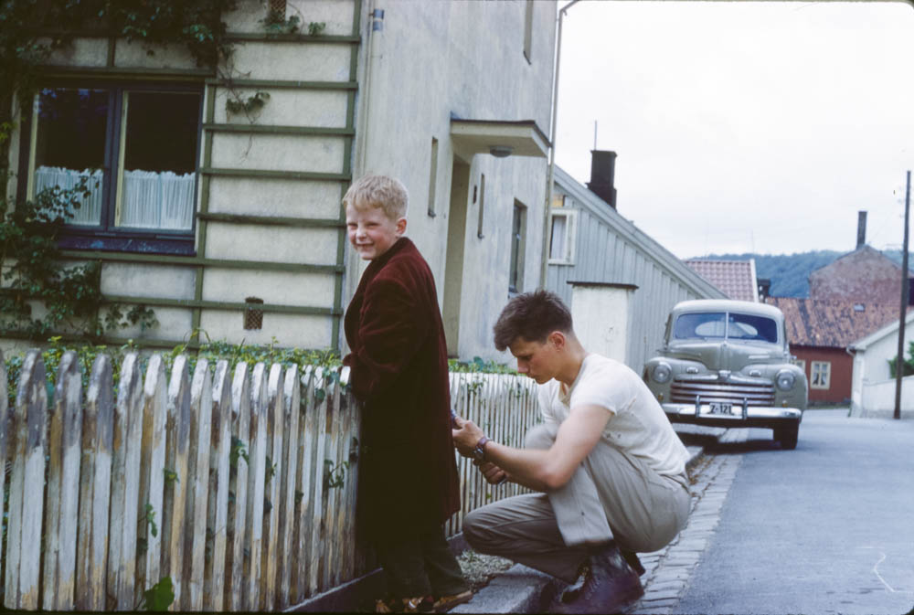 Karlsrostredet 8, Larvik Halvard scraping old paint off fence. With Morten and Isti. June, 1960