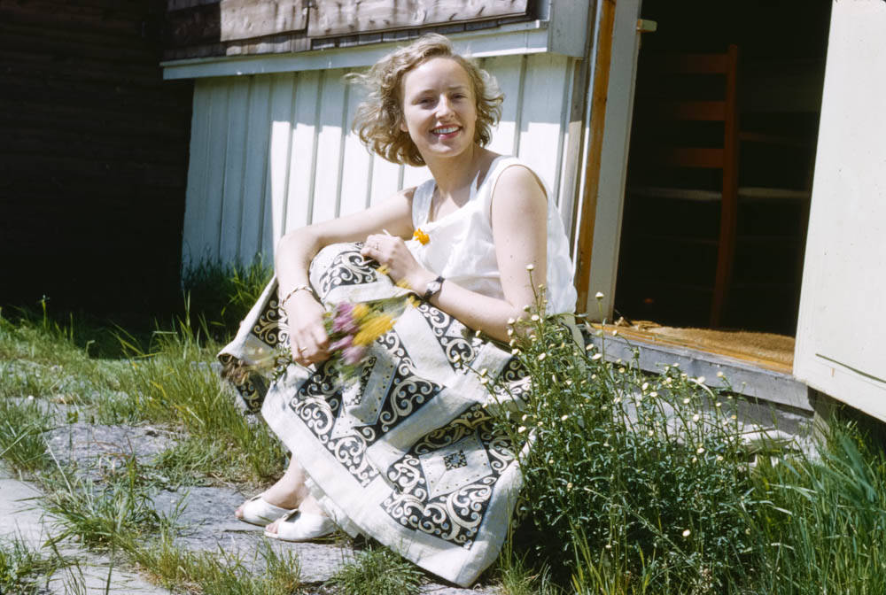 Margaret (Maggie) Midelfort and her scratch pad catching the mood of the land. Jotunheimen, Norway June 27, 1960