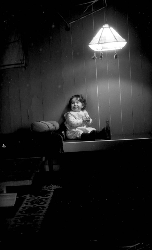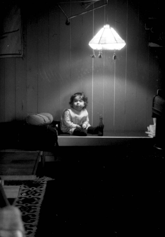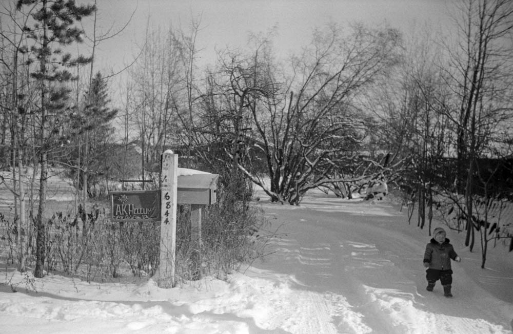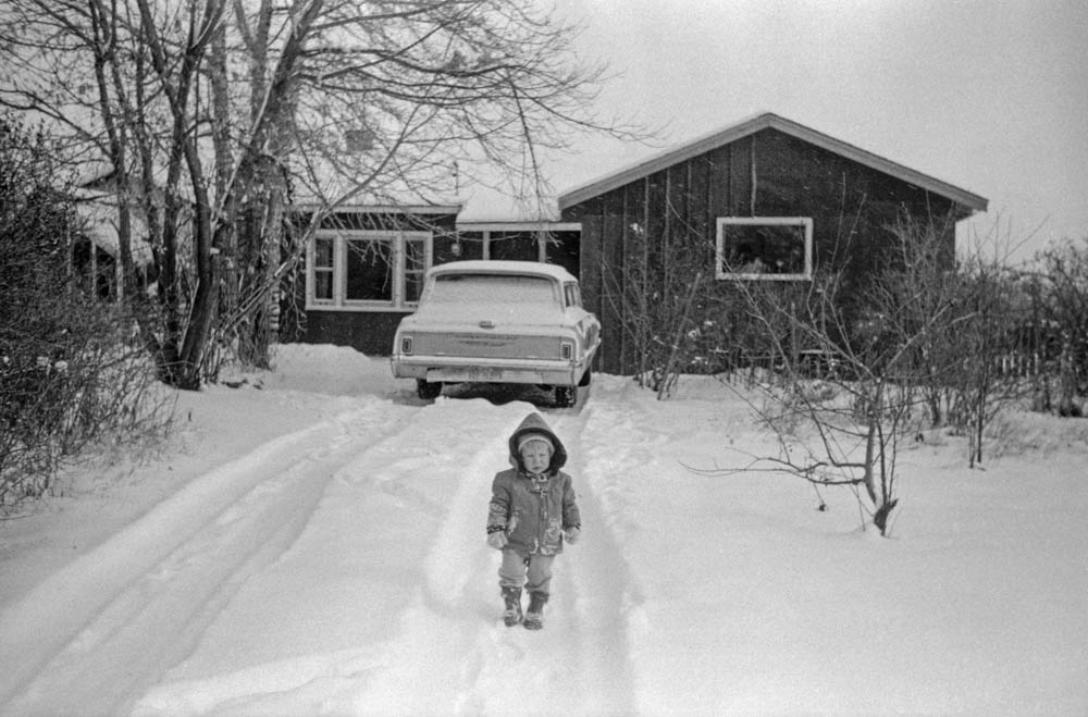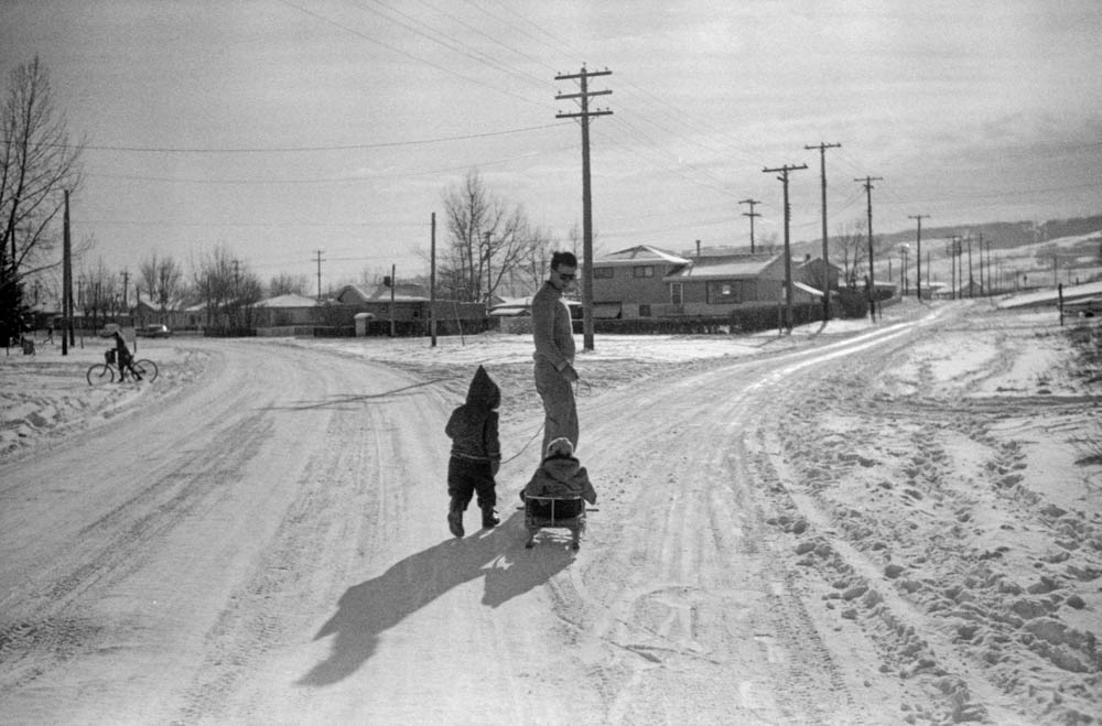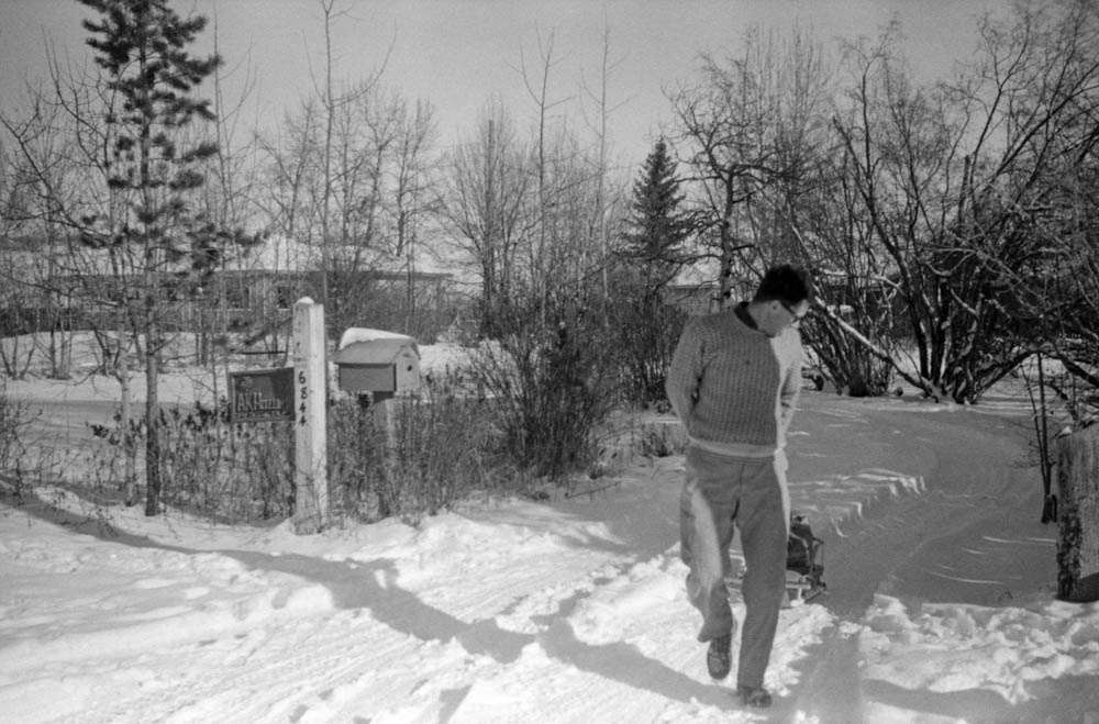 A.K. Hellum pulling Timothy Hellum on a sled at 6844 Bow Crescent