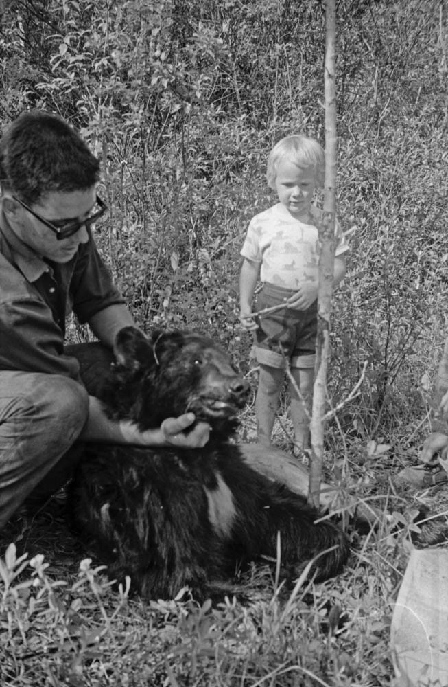 Jennifer Hellum and a colleague of A.K. Hellum skinning a shot bear.