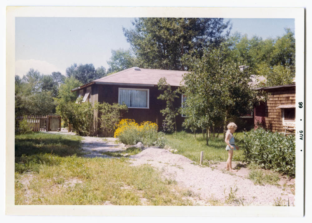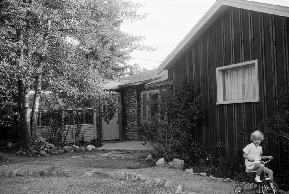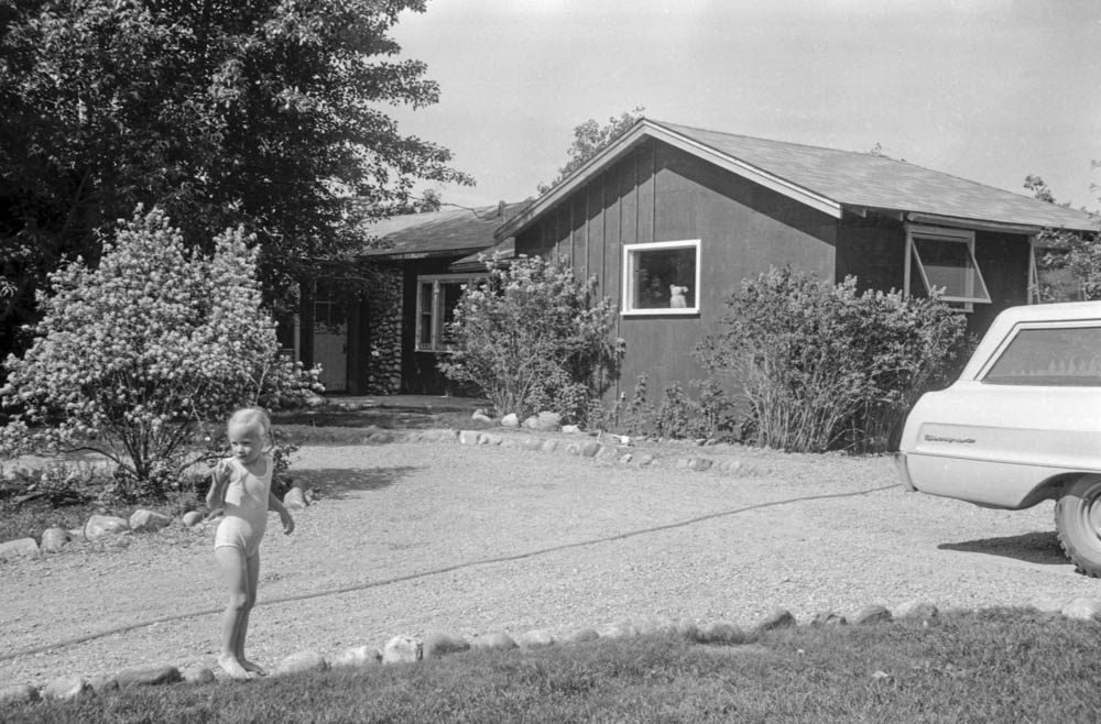 Hilary Louise in playpen and Jennifer and Timothy Hellum painting on an easel, and A. K. Hellum painting the side of the house at 6844 Bow Crescent.