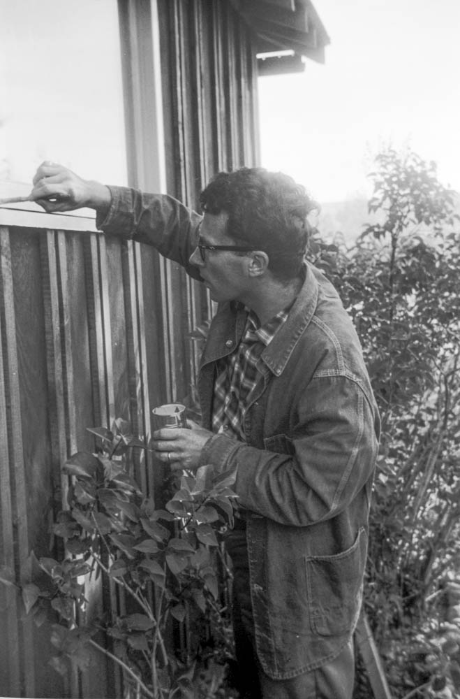 A. K. Hellum painting trim on the side of the house at 6844 Bow Crescent.