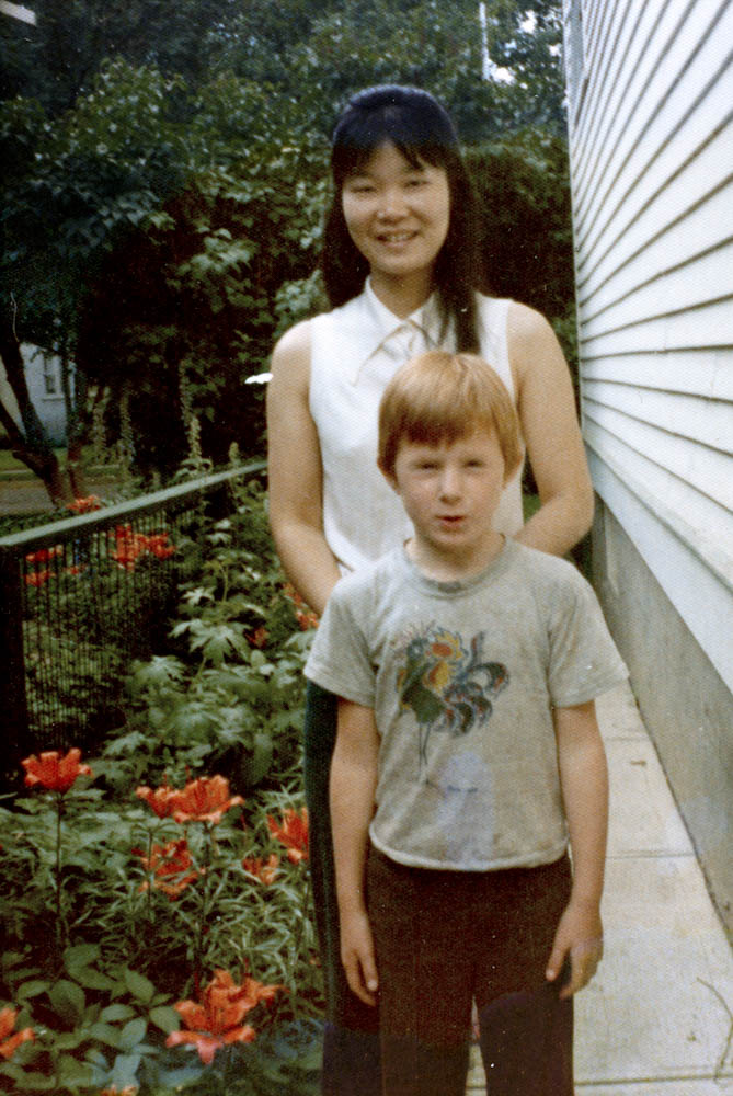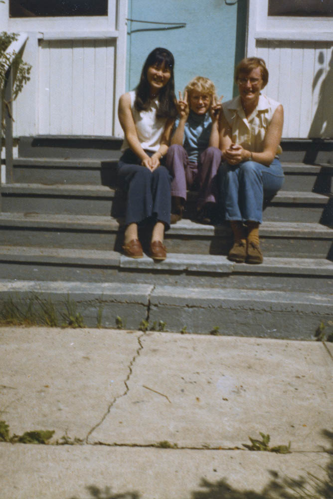 Kyoko Kawakami, Jennifer and Hilary Hellum on the steps of our rental house at 11020-84th ave in Edmonton (while Rushouse was being built). Kyoko was our violin teacher. July 7, 1972